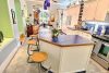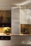 It is a handleless kitchen concept, which preserves the clean look. The yellow ceramic backsplash brightens the space and makes us want to smile, an unexpected favorite in the realization of this project. The vast island in her kitchen is topped with a Miralis surface, an ultra-compact, highly resistant countertop.