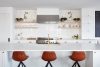 With a minimalist look and sparkling white accents, this kitchen —whose organizational space has been designed to allow the family to spend most of their time there— is both the heart of the condo and of family gatherings.