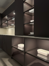 En mettant une fois de plus en valeur notre matériau d'ingénierie de haute qualité, le Noir Kafé Lino, cette arrière-cuisine présente également notre nouveau produit, Luminescence. L'objectif de cette pièce était donc de permettre aux visiteurs de notre kiosque de découvrir notre solution d'éclairage LED. Conçu par Miralis, ce produit d’éclairage est intégré directement en usine dans les caissons, offrant une solution unique, fonctionnel et raffinée pour votre espace de vie.