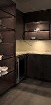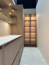 Véritable attraction du kiosque, cette cuisine a capturé le cœur de nombreux visiteurs. Elle met en avant notre placage de bois de haute ingénierie, le Noyer chaga, un matériau durable qui résiste aux rayons UV et conserve sa couleur intacte des années durant, garantissant une beauté pérenne. L'audace de l'utilisation des surfaces compactes renforce le design : le Dekton Sabbia s'étend des comptoirs jusqu'au mur de la télévision et enveloppe même la hotte, créant une continuité visuelle qui définit une ambiance résolument contemporaine. Chaque détail a été conçu pour inspirer et captiver, en reflétant la modernité.