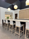 Étant le deuxième espace de notre kiosque, nous avons voulu démontrer l’étendue de l’offre Miralis, en mélangeant un style traditionnel avec une touche de modernité. Cette cuisine met en avant nos portes de style shaker associées à notre nouveau Laminé européen Akène Assyrtico, où l’intérieur des caissons est assorti à l’extérieur pour évoquer le look d’une cuisine en bois massif. La fonctionnalité de l’espace a été conçue pour une grande famille, offrant à chacun la place de mettre la main à la pâte. Notre nouvelle couleur, Noir Kafé Lino, que nous retrouvons sur les deux grands îlots, apporte de la chaleur à la pièce.