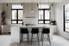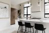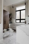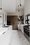 Résidence des Chardonnerets. Inspirée par l’architecture des grands bungalows mid-century, cette nouvelle résidence a paliers multiples est positionné sur un site boisé à flanc de montagne. Les années soixante et l’environnement naturel ont teinté la palette de matériaux choisis pour l’aménagement de cette cuisine tout en maintenant un style résolument contemporain. Un assemblage complexe de panneaux de porcelaine vient draper l’îlot et ses rangements sur trois côtés jusqu’au sol afin d’exprimer le superbe veinage du comptoir.